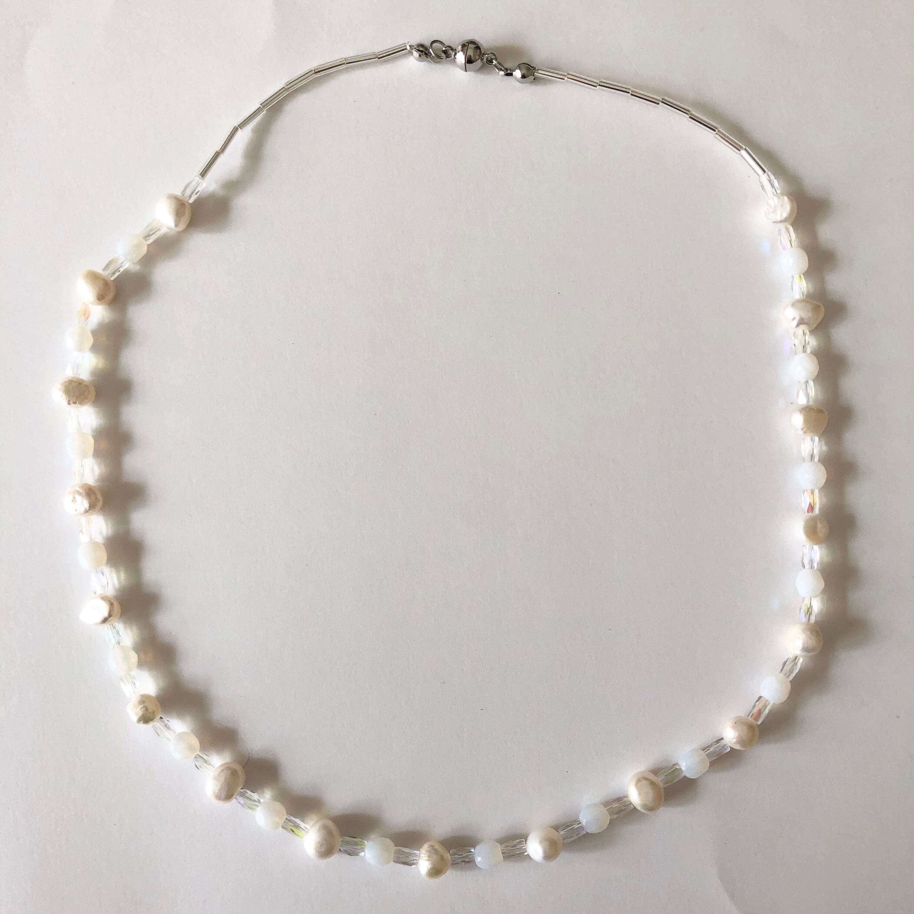 ミルクビーズ、オーロラビーズ、淡水パールに日本製のシルバー竹ビーズを使ったハンドメイドのネックレス。淡水パールをこれでもかって程使いました。