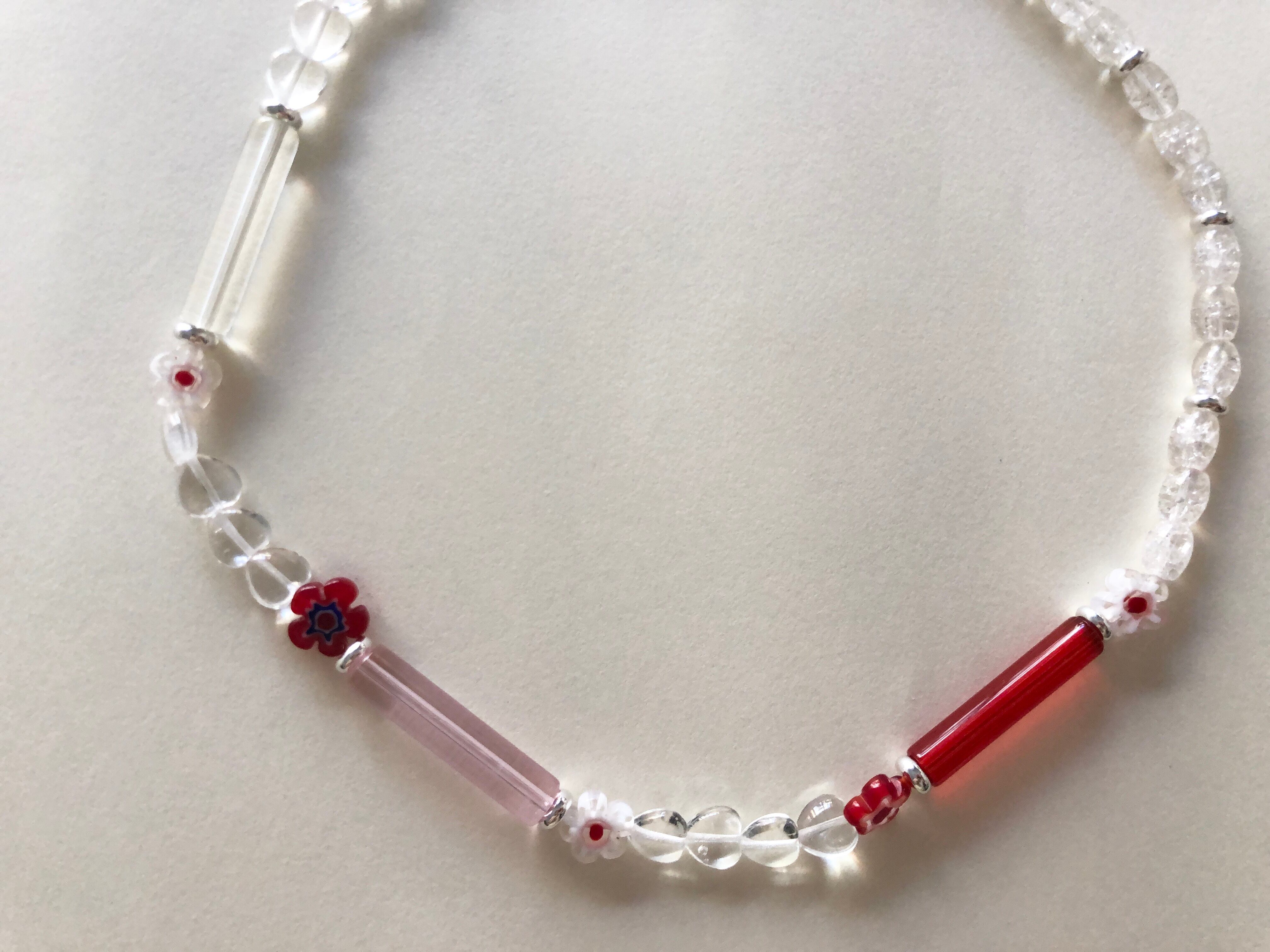 アメリカのチューブグラスに、ハートのガラスビーズを挟みました。また、アクセントに赤や白のMillefiori ビーズを使い、バックにはクラックビーズを使用しています。全て、アメリカで手作りされたパーツを輸入して作っているので、こちらは一個しか作れません。