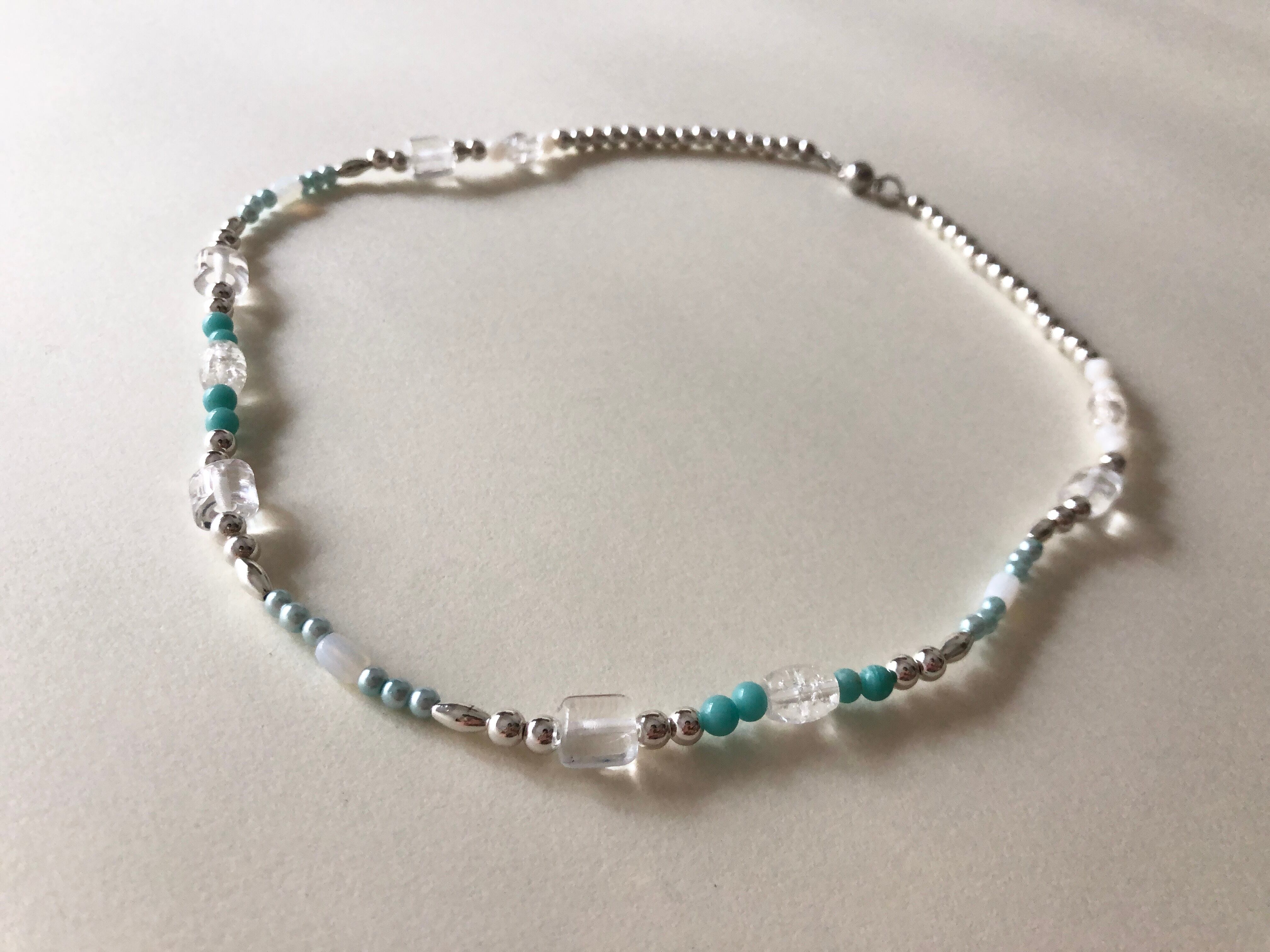 手作りの透明なチューブグラス、Cherry Brandの手巻きビーズ、デッドストックのシルバーパーツ、クラックビーズ、琥珀、オモチャパールなど、様々なパーツを使って作りました。